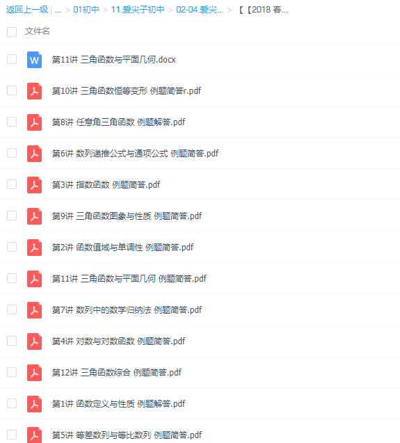 此课件来自爱尖子网校,2018春季爱尖子初二数学竞赛专属课完结。此课件主要知识点包括:函数定义与性质、函数值域与单调性、指数函数、对数与对数函数、等差数列与等比数列、数列递推公式与通项公式、数列中的数学归纳法、任意角三角函数、三角函数图象与性质、三角函数恒等变形、三角函数与平面几何、讲三角函数综合、初二春季班期末测试。
