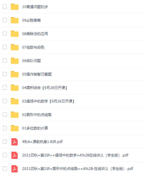 此课件来自学而思网校,王睿四年级数学培优2021年秋季班视频课程。此课件主要知识点包括:多位数的计算、图形中的点线角、操场中的数学、面积综合、操作类智巧趣题、排队问题、组数与染色、乘除法的应用、必胜策略、最值问题初步、有备无患、乘法竖式谜、逻辑推理 、数表中的周期、除法竖式迷、寻找规律。
