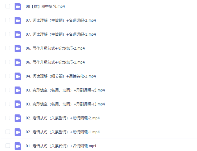 此课件来自作业帮网校,牟恩伯2021秋季高一英语秋季冲顶班更新14讲。主讲牟恩伯老师写作逻辑以英语语言逻辑为根,以高考考试规律为本,帮助学生精确打击高考考点。目前秋季班已经更新的目录是:定语从句(关系代词)+名词词缀、定语从句(关系副词)+动词词缀、完形填空(名词、动词)+形副词缀、阅读理解(细节题)+词性转化、写作升级句式+听力技巧、阅读理解(主旨题)+名词词缀、阅读理解(主旨题)+ 名词词缀、时态难点突破+动词词缀、定语从句(介词 + 关系代词) + 形副词缀、定语从句难点突破 + 词性转换、完形填空(形副_逻辑)+ 听力技巧等。